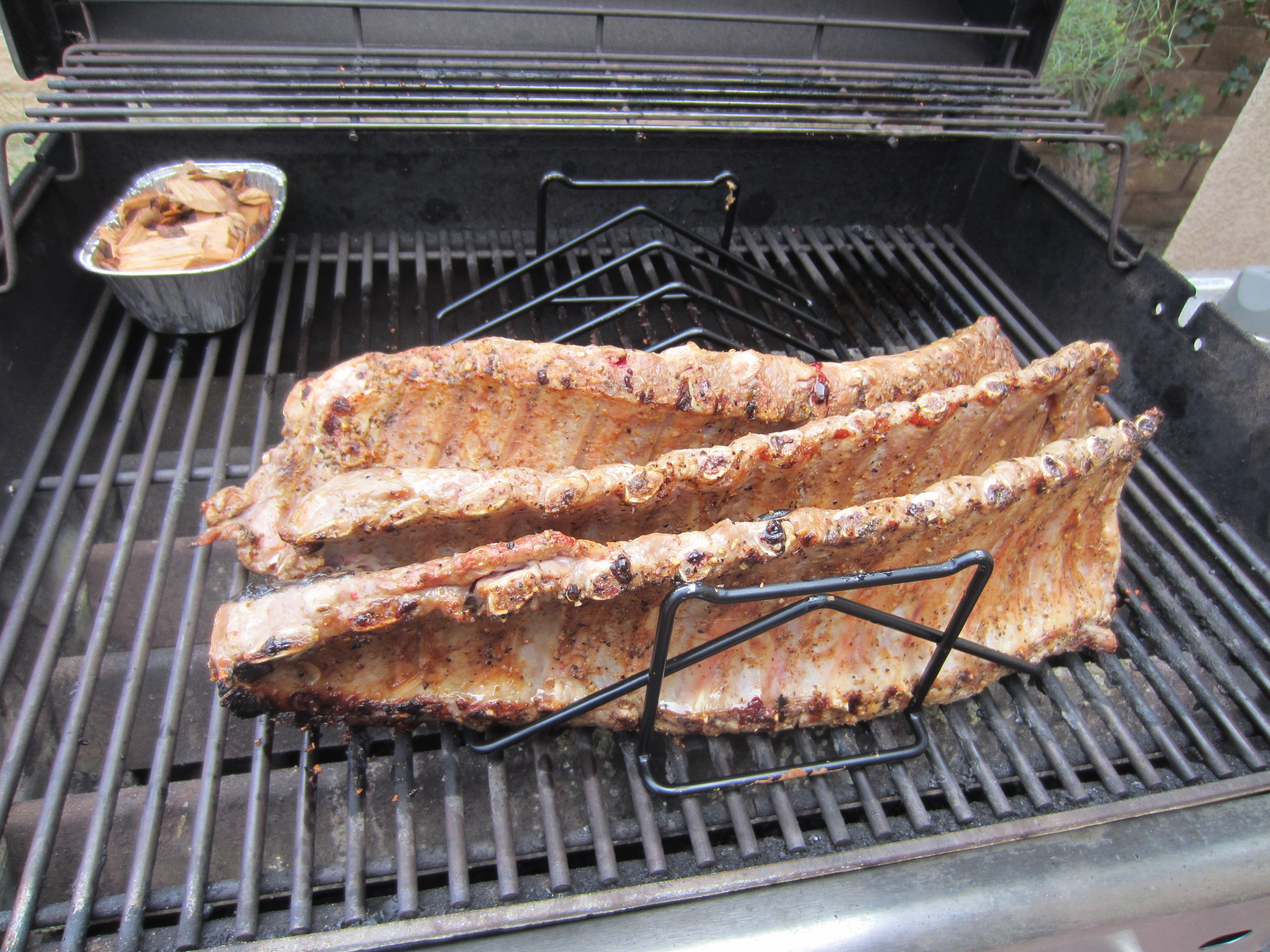 Start Cooking:  OIMG_1557nce the wood chips begin to smoke, remove the racks of ribs from plastic bag and place directly on the grill for 2 or 3 minutes until obvious grill markings start to appear and then turn over and similarly sear the opposite side. Reduce Heat by turning off all burners except one, ideally at the perimeter of the BBQ. Place ribs in a standing rib rack situated where the engaged burner does not directly provide heat. Maintain temperature of the BBQ at 300F (150C). Keep lid closed for at least 1 ½ hours and then rotate ribs in the rib rack so that the opposite end points toward bottom of the BBQ. Continue cooking for another hour with lid closed. Feel free to check occasionally to make sure the ends aren’t burning. Open lid and brush ribs on both sides with BBQ Sauce during the last ½ hour 2 or 3 times. Total cooking time, approximately 3 hours, depending on how meaty the ribs are.